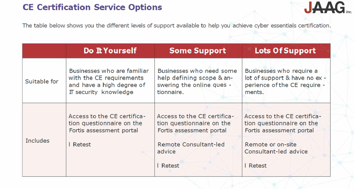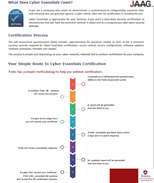 JAAG Inc. has partnered with Fortis Information Security & Risk Management Solutions an approved UK-based Cyber Essentials auditor and certification partner, to bring this capability to US based companies.